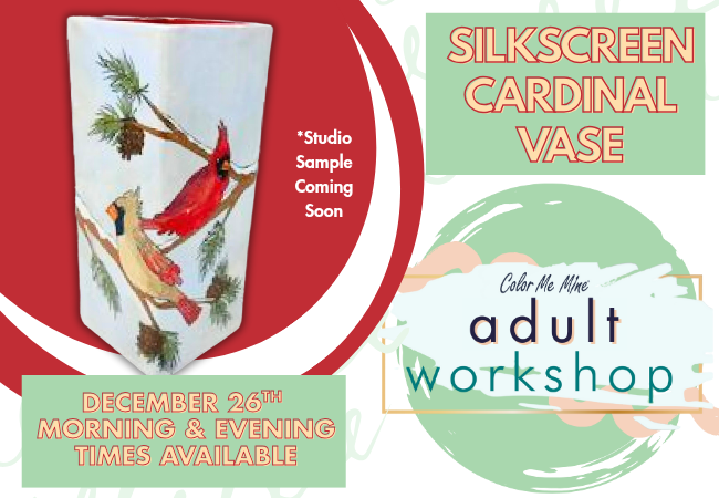 - DECEMBER PROJECT: Purchase any of our flat vases or other in-stock ceramic items and our guiding artist will share tips on how easy and fun it is to paint a winter themed cardinal design using the silk screen technique.