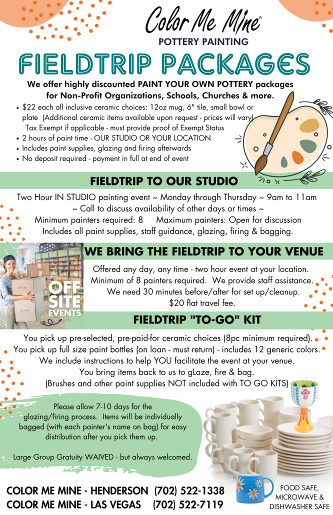 COLOR ME MINE Pottery Painting makes a fun and creative field trip. Field trip and Non-Profit Event prices range from $22 and UP per person. Please call the studio for more details. We are more than happy to work with you if you have something specific in mind.