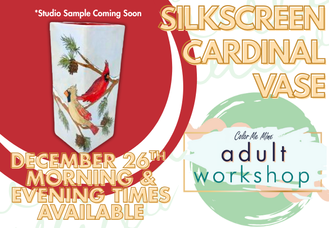 - DECEMBER PROJECT: Purchase any of our flat vases or other in-stock ceramic items and our guiding artist will share tips on how easy and fun it is to paint a winter themed cardinal design using the silk screen technique.