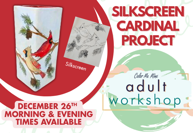 - DECEMBER PROJECT: Purchase a flat-sided vase, platter or other in-stock ceramic item and our instructor will guide you to paint this winter themed cardinal design.